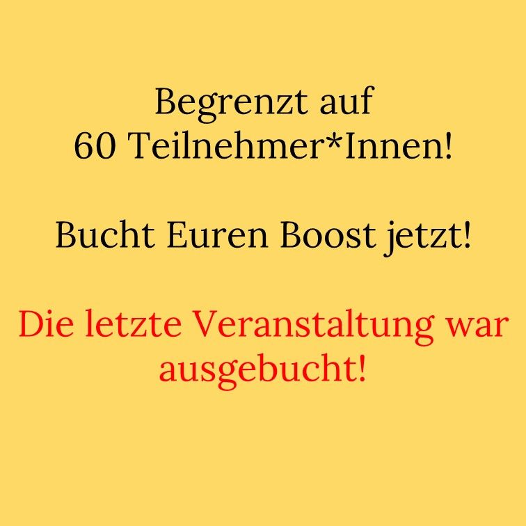 Da die Atmosphäre der zurückliegenden Booster so positiv und herzlich und schon fast „ein Booster-Spirit“ zu empfinden war, haben wir gedacht, dass es auch schön wäre, wenn wir am Freitagabend gemeinsam feiern. Wir haben den angesagten Szene-Club „DRUSHBA“ angemietet und wollen mit euch einen „heißen Abend“ auf dem Dance-Floor verbringen und mit Techno, Elektro und natürlich auch euren Music-Favorites den Schwung des Tages mit in die Nacht nehmen.